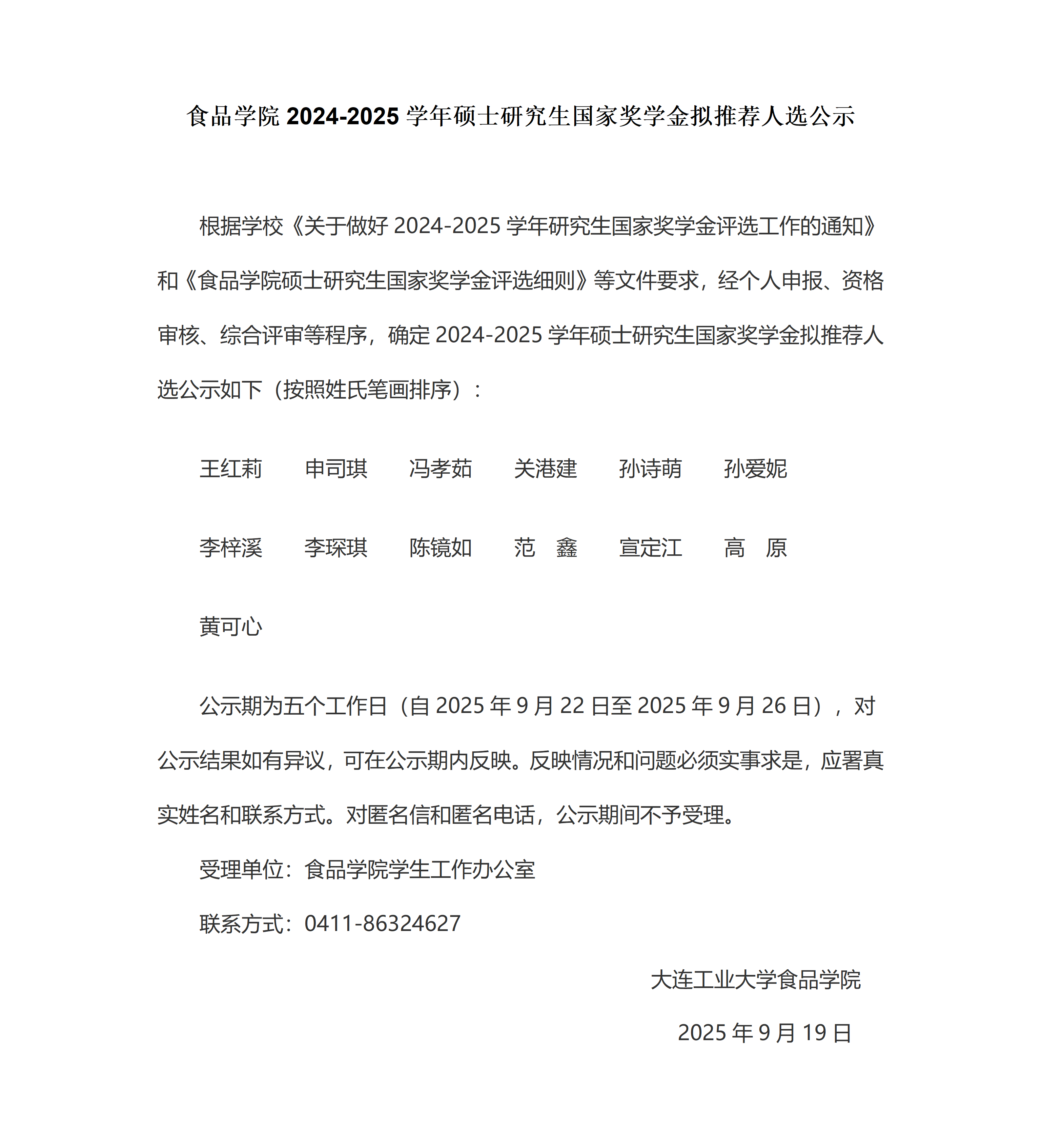 食品学院2024-2025学年硕士研究生国家奖学金拟推荐人选公示