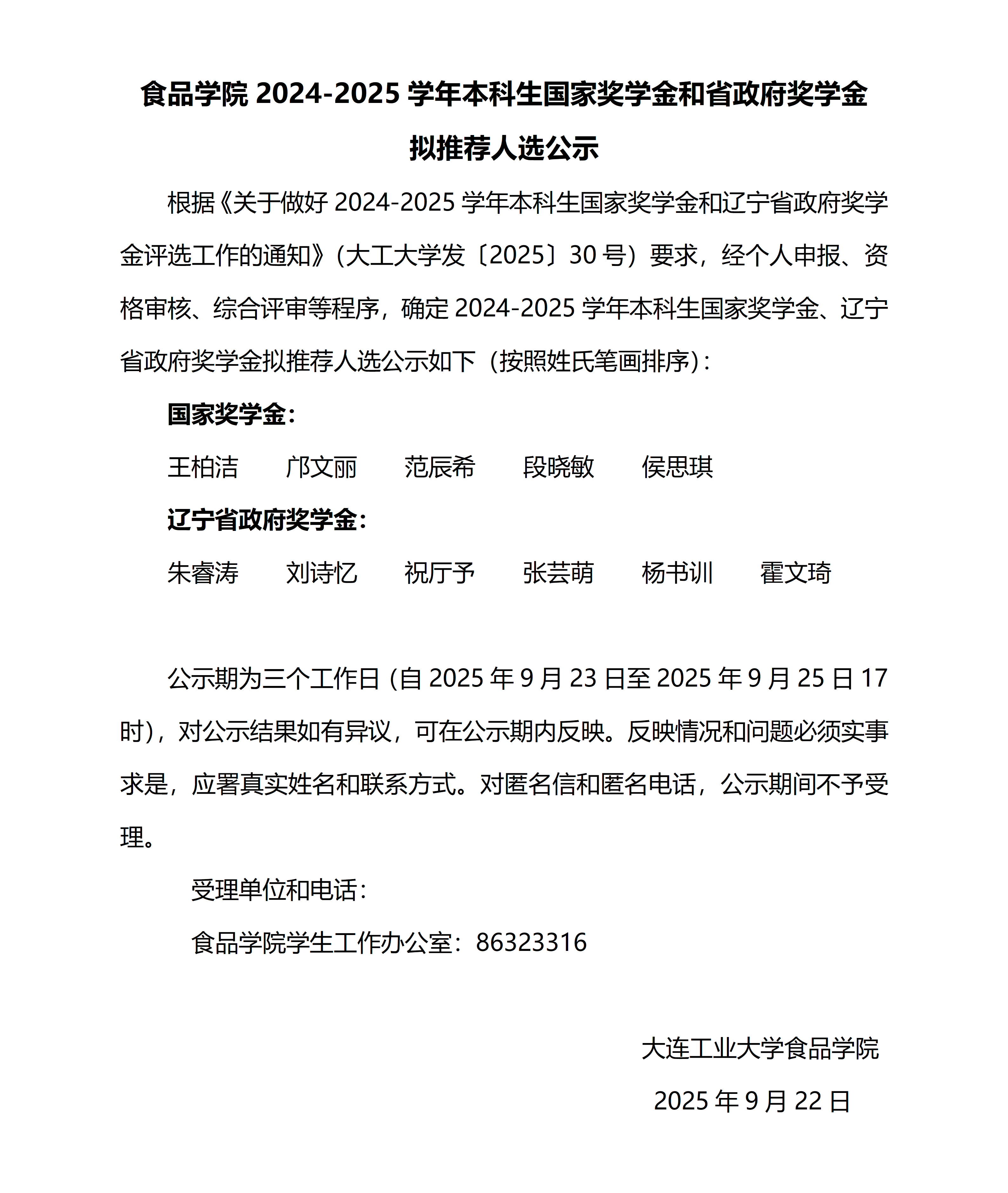 食品学院2024-2025学年本科生国家奖学金和省政府奖学金拟推荐人选公示