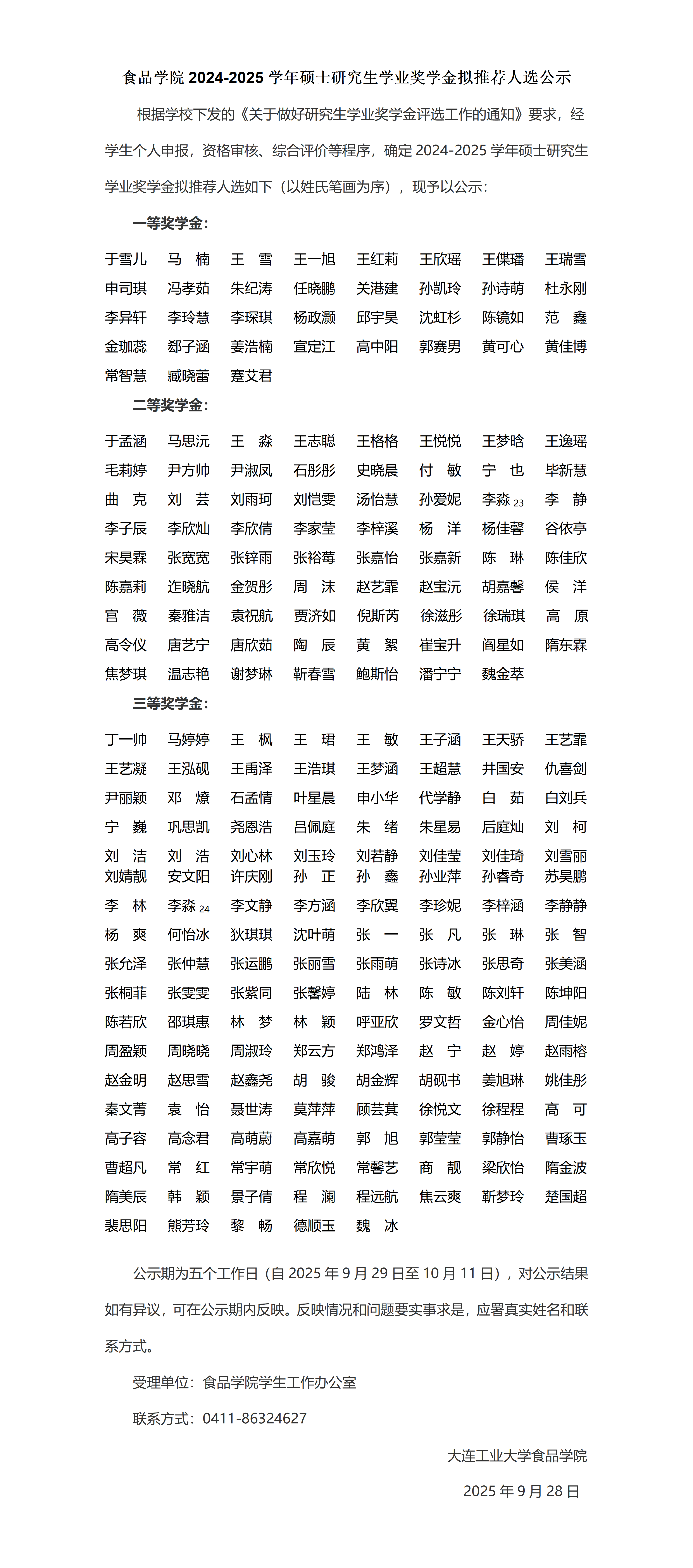 食品学院2024-2025学年硕士研究生学业奖学金拟推荐人选公示