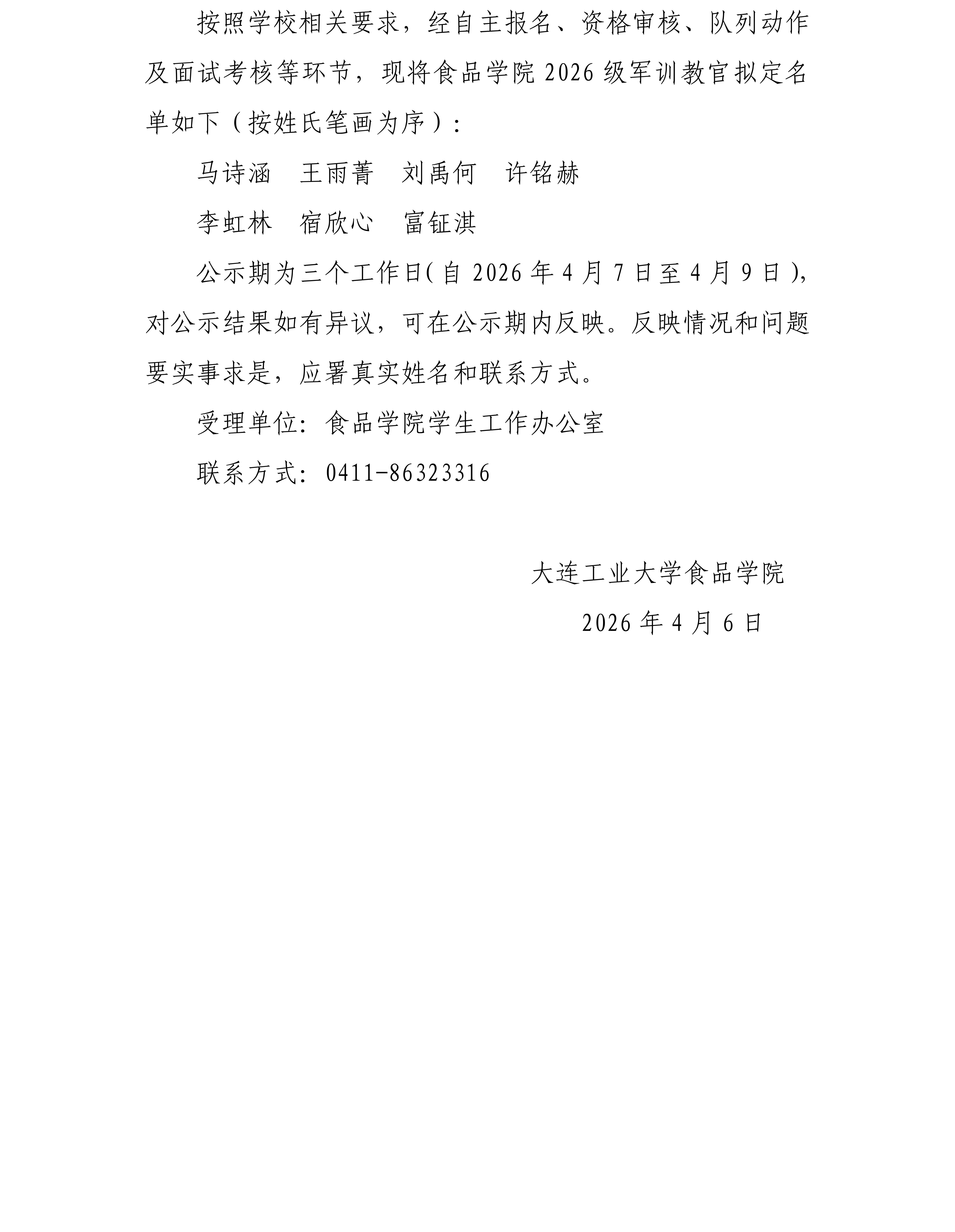 食品学院2026级学生军训教官拟定名单公示